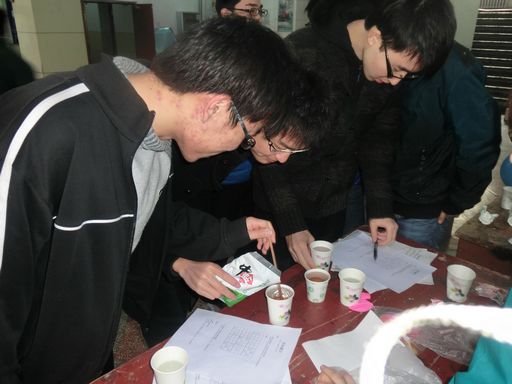 活动采取按完成的题目数目分发奖励的形式。活动设有5个题目,分别是填数独、还原魔方、限时折纸、巧悬鸡蛋、空杯吸气球,并在现场提供了气球、纸杯、墨水等辅助道具,要求同学们以个人或者组队的形式参加。11点半活动正式开始,工作人员边发传单,边介绍活动内容,吸引了许多过往的同学。同学们选好比赛项目后有的冥思苦想,有的动手实践,活动现场欢声笑语,好不热闹。有挑战数独很久仍在坚持的,有小心翼翼加盐使鸡蛋悬浮的,还有努力回忆儿时折纸技巧的。随着活动的进行,一些魔方爱好者、数独高手纷纷出手,赢得了阵阵欢呼。而在活动即将结束时一组同学不负众望,将5个题目全部完成,夺走大奖,让现场很多同学羡慕不已。