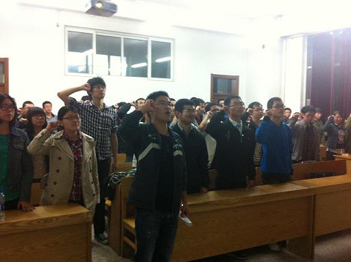 团委社管中心部部长带领大家进行无偿献血志愿者宣誓。之后由哈尔滨无偿献血志愿工作者服务组织负责人王晓明为大家进行今天的培训。王晓明先生凭借着自己7年来丰富的志愿者经验,向同学们讲述了血液的基本知识以及无偿志愿工作者的工作规范,他还亲自带来了献血过程中专业的医疗物品,和大家进行互动。