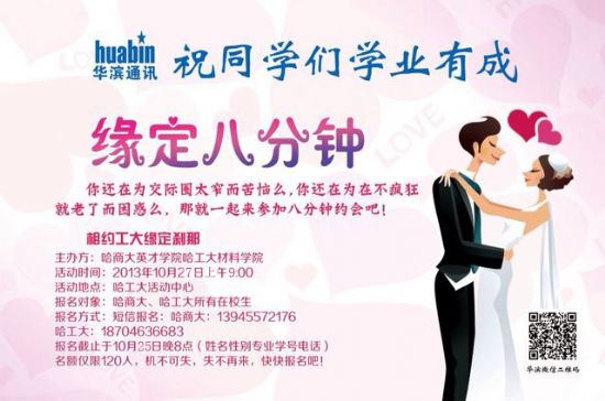 与哈商大英才学院联合主办的“缘定八分钟”活动即将开展。来这里寻觅能陪你共度大学的青春伴侣,抓住自己的幸福,把握现在,开始吧!“缘定八分钟”,我们的与您不见不散!