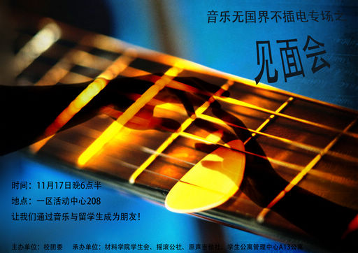 学生会、原声吉他社、摇滚公社、学生公寓管理中心A13公寓联合承办的大型不插电晚会《音乐无国界不插电专场》在11月中下旬重磅来袭。