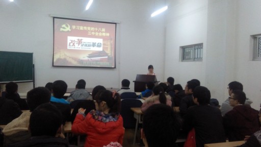 学习十八大三中全会的精神,了解国家改革动态,对当代大学生合理规划人生、确立正确的人生观、价值观有着十分密切的联系。通过当天的学习,同学们提高了自我认知,坚定了报效祖国的信念。相信在今后的学习生活中,再接再厉,不负众望!