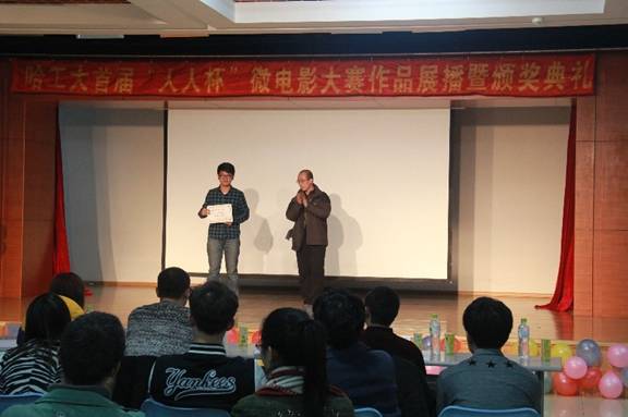 参与本次微电影比赛的队伍中有社团、班级、还有同学自行组成的小分队。经过一个月的拍摄制作,总共有15部作品上交,经过严格的选拔,共有8部作品入围最后的决赛展示。随着校园十大歌手张奥博同学的倾情助唱,颁奖晚会正式拉开帷幕。8支队伍依次展示并讲解了自己精心拍摄制作了一个月的微电影。参与本次微电影大赛的作品均属原创,题材新颖,情节丰富,感情动人,在现场展播中不时引来阵阵掌声。贯穿在各个展播视频中间的还有激动人心的抽奖环节以及校园十大歌手的精彩演绎,他们配合着精彩的微电影将本次活动推向高潮。经过评委老师的认真评审、现场观众的用心投票、场外观众的大力支持,AIMO魔术社的《Ambition Card》因情节紧凑,制作精良,意味深长,力压其他队伍拿到了本次微电影大赛的最佳微电影奖,同时获得了2000元现金奖励。《工科男的实验》因诙谐幽默,贴近生活,深受同学认可获得了最佳人气奖,拿到了1200元现金大奖奖励。另有5支参赛队伍各拿到了600元的单项奖奖励。颁奖结束后,伴随着评委的认同和到场观众的赞许,全场起立鼓掌,主持人宣布本次微电影大赛颁奖晚会到此结束。