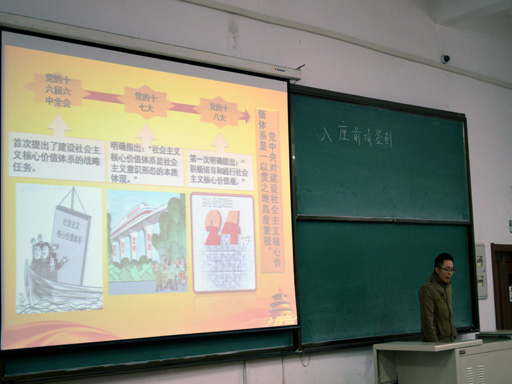分校2015春预备党员培训班学员讲坛第一讲于正心22顺利举行,讲坛由管委会主席刘庆永主持,四名演讲的学员分别是13硕的李泓江、代想想、陈晓宇和张夏明同学。