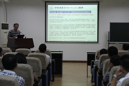 首先,耿书记从王树权书记《以“三严三实”推进世界一流大学建设》主题报告入手,讲解了“三严三实”提出的过程,认真解读了“三严三实”的基本内涵与重要意义:“三严三实”专题教育为加强党员干部修养、深入推进新形势下党的建设提供了重要遵循;对深化高校学习教育、打牢思想根基、推动教育改革发展具有重大现实指导意义。