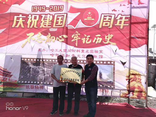 上午十点,在庄严的国歌声中 “不忘初心,牢记使命”迎国庆露天主题活动在知青博物馆前菜园内正式开始,馆长王怀信介绍了参加活动的人员,黑龙江省中华文化促进会秘书长王广贺首先发言,抗联烈士后代李景梅女士给大家讲述了东北抗联的历史,空间材料重点实验室党支部书记刘海讲话并代表实验室向博物馆授予了《实验室历史文化教育基地》牌匾,最后参加活动人员共同进行了联谊活动。