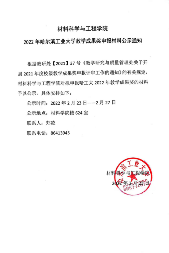 材料科学与工程学院2022年里番 教学成果奖申报材料公示通知