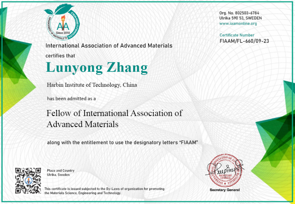 材料科学与工程学院张伦勇副教授荣获国际先进材料学会科学家奖并增选为IAAM终生会士