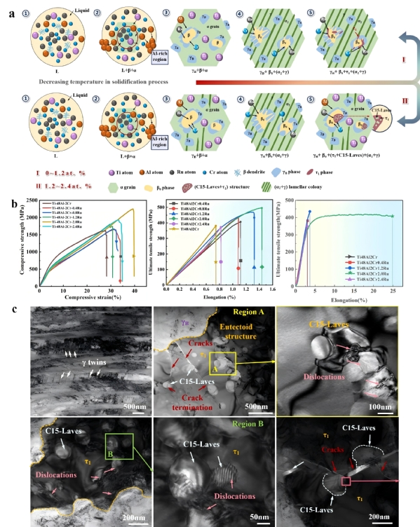图2 a为含Ru钛铝合金凝固过程中固态相变示意图,b为显著提升的室温压缩、室温拉伸和850℃拉伸性能,c为高温拉伸后共析结构与位错的形貌特征