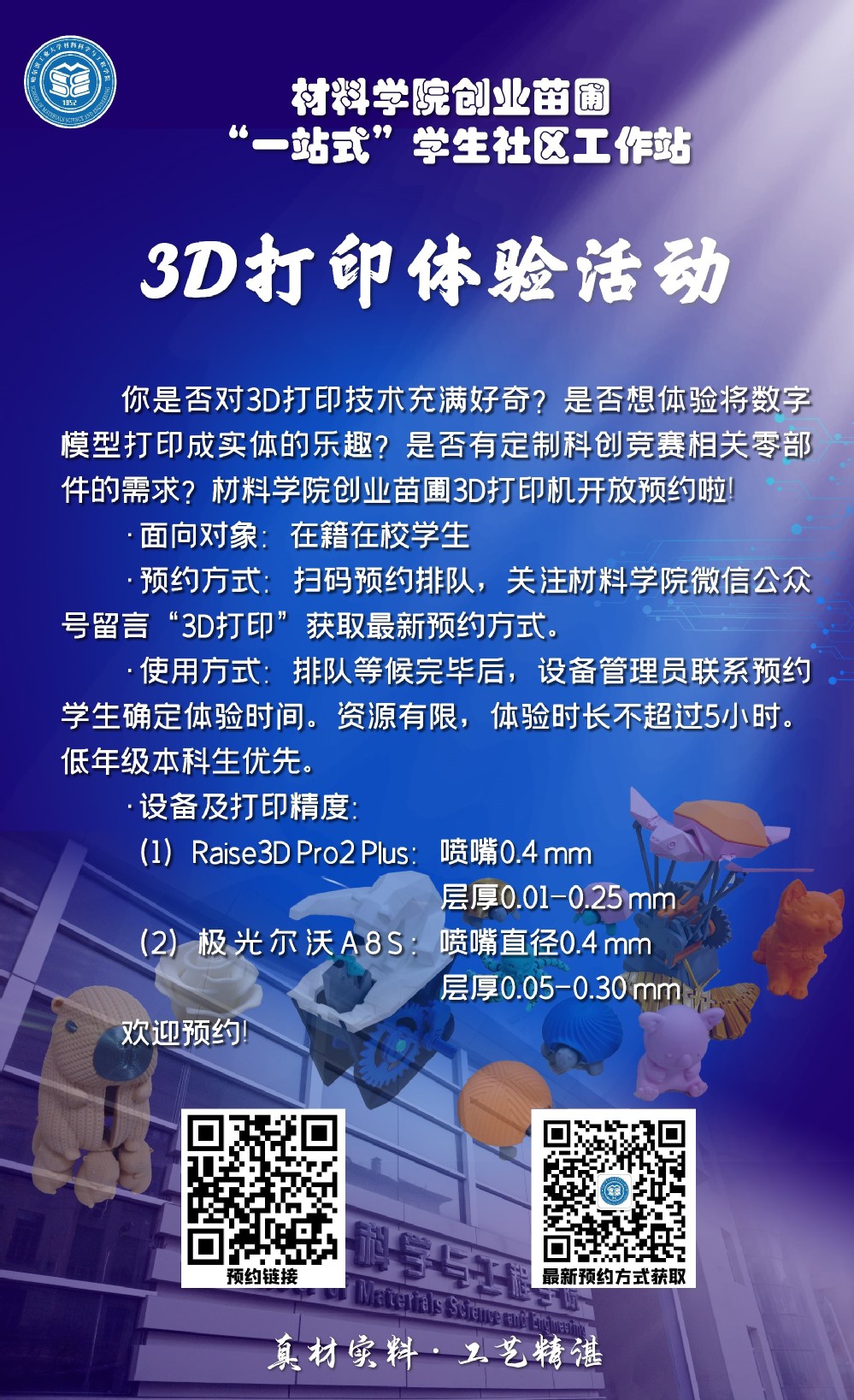你是否对3D打印技术充满好奇?你是否想体验将数字模型打印成实体的乐趣?你是否有定制科创竞赛相关零部件的需求?为更好支持学生创新创业活动,激发学生创新意识,里番 双创苗圃“一站式”学生社区工作站FDM 3D打印机现面向全校学生开放体验。设备地点、预约方式、技术指标等如下: