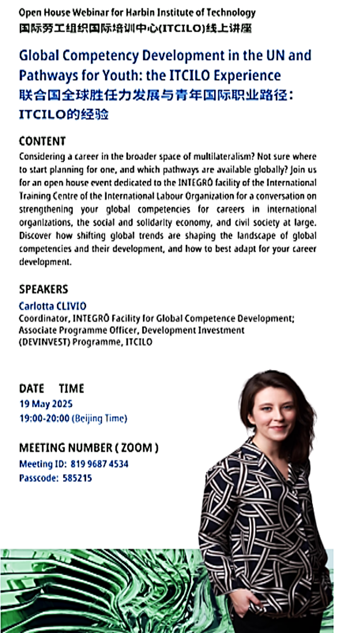 主讲内容:为帮助有志青年探索国际组织职业发展路径,聚焦解析全球趋势下新兴技能需求与职业发展策略、探讨可持续发展领域从国际机构到基层的多层次实践机会、介绍国际劳工组织国际培训中心ITCILO系统化的青年领袖培养体系三大核心议题,助力参与者提升全球胜任力,在多边主义、社会企业与公民社会领域开启职业新征程,诚邀有志于多边主义事业的青年参与!