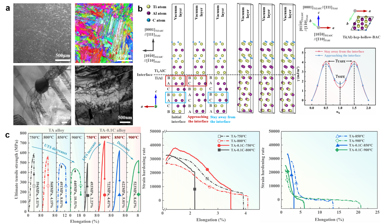 图2 a为掺杂C后钛铝合金的凝固组织与高温拉伸组织,b为Ti2AlC/TiAl界面附近和远处滑动的第一性原理模型和广义层错能量曲线,c为掺杂C前后高温拉伸性能与加工硬化率曲线