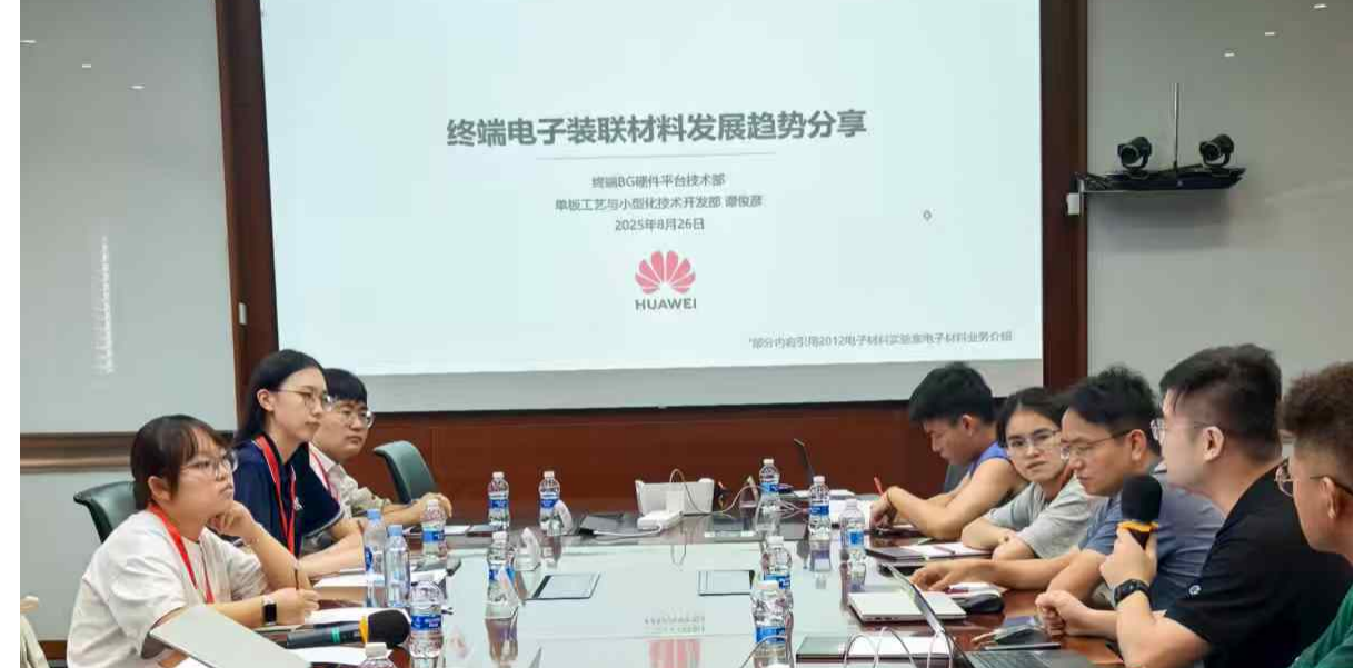8月26日下午,实践团走进华为运动健康科学实验室,实地观察材料技术在智能穿戴设备中的创新应用:从柔性屏基材到传感器导电材料,每一项材料创新都为产品轻量化、高精度赋能。在终端BG部门交流中,华为终端高级工程师黄礼忠、经理谭俊彦以“终端电子装联材料应用与发展趋势”为主题,结合Mate60屏幕脱胶解决方案、摄像头马达胶水质量控制等案例,对比高校与企业材料研发的差异——高校侧重材料性能调控,企业则聚焦“需求分析-规格制定-量产落地”的系统工程,让成员们深刻认识到“材料技术产业化需兼顾性能、成本与工艺适配性”。