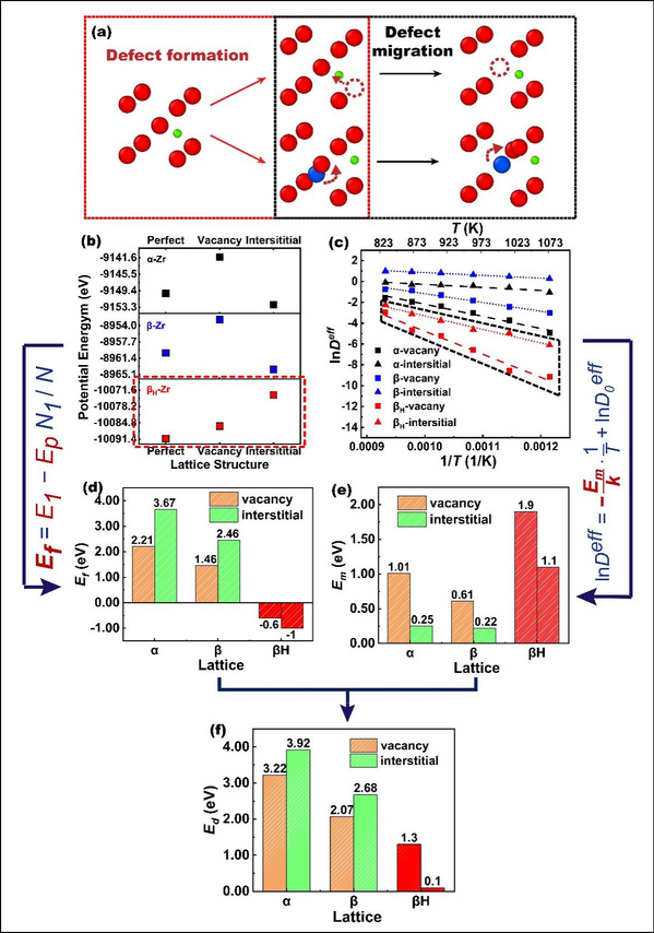 图2 扩散激活能计算过程:(a) βH-Zr 晶格中缺陷形成与迁移的示意图;(b)不同晶格Zr势能;(c)不同晶格Zr缺陷形成能;(d)不同晶格Zr有效扩散系数与温度关系;(e) 不同晶格Zr缺陷迁移能;(f) 不同晶格Zr 扩散激活能。